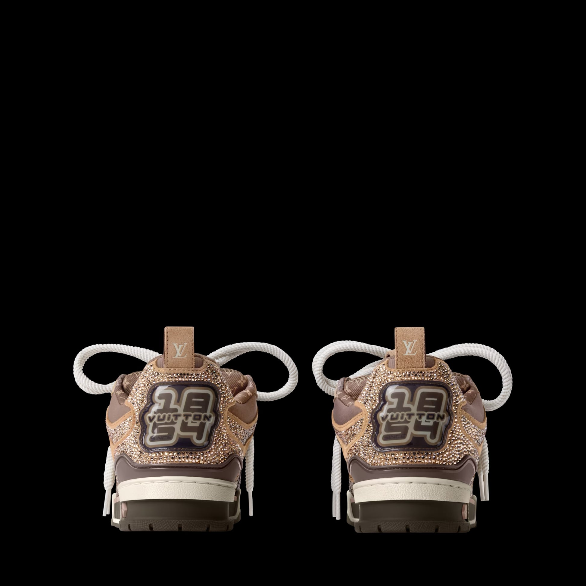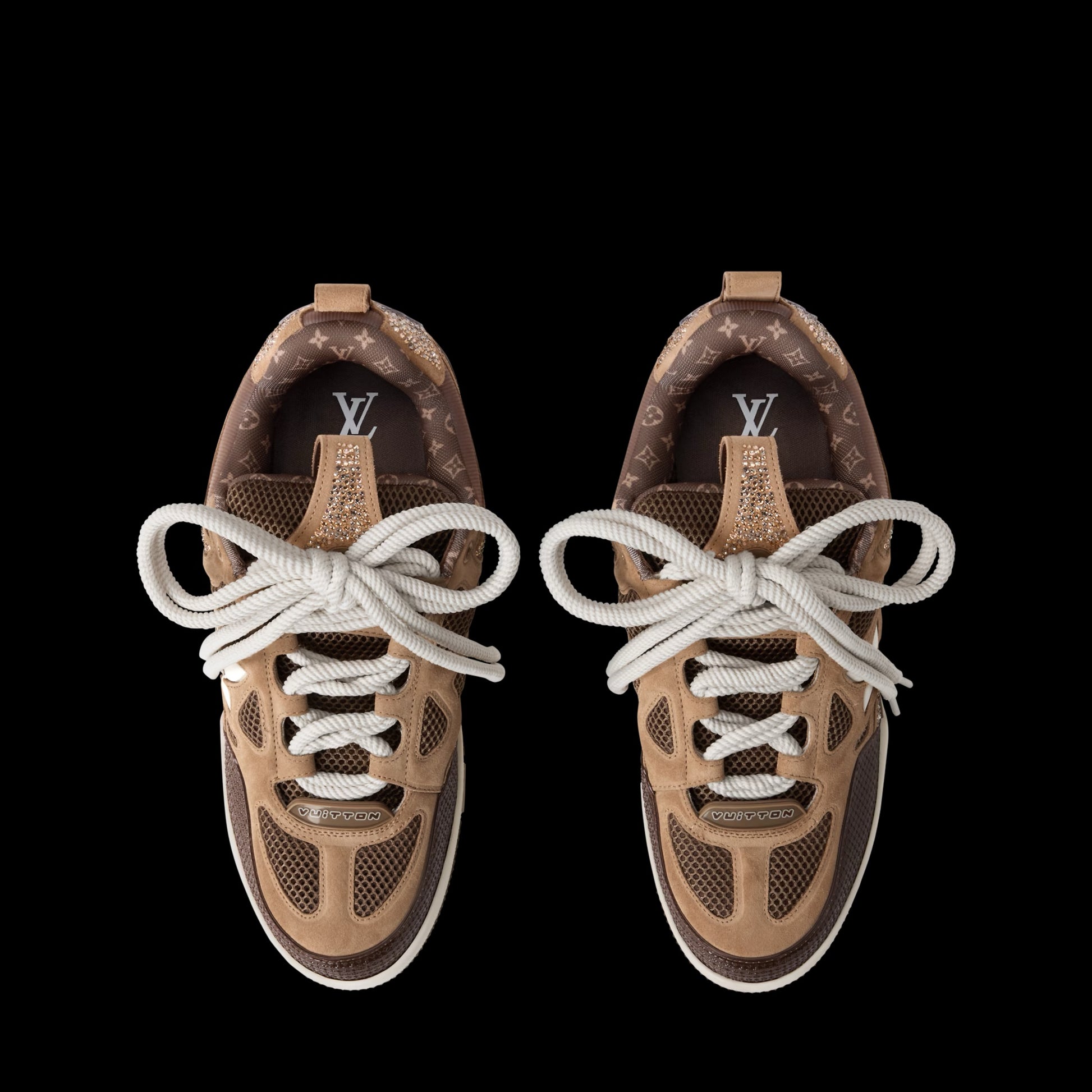 This elevated edition of the LV Skate sneaker comes in nubuck calf leather richly embellished with sparkling Swarovski™ crystals. They highlight the elaborately constructed upper with its padded collar and exaggerated tongue, inspired by Nineties' skate shoes. This model features multiple House signatures, including a Monogram lining and a Monogram Flower on the side.